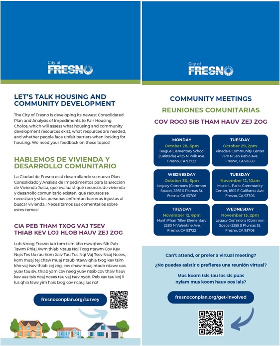 Fresno is California’s fifth-largest city, with a diverse population of over 550,000 residents. Mosaic worked with the City on their Consolidated Plan and Analysis of Impediments to Fair Housing Choice in 2019-2020 and again in 2024-2025. For its most recent plans, the City sought to expand upon the extensive community engagement conducted in its previous work with Mosaic. Publicity efforts included door hangers placed at households within one mile of meeting locations, a project website that garnered more than 4,000 visits, and social media posts in English, Spanish, and Hmong, informing residents about upcoming meetings and the community survey.